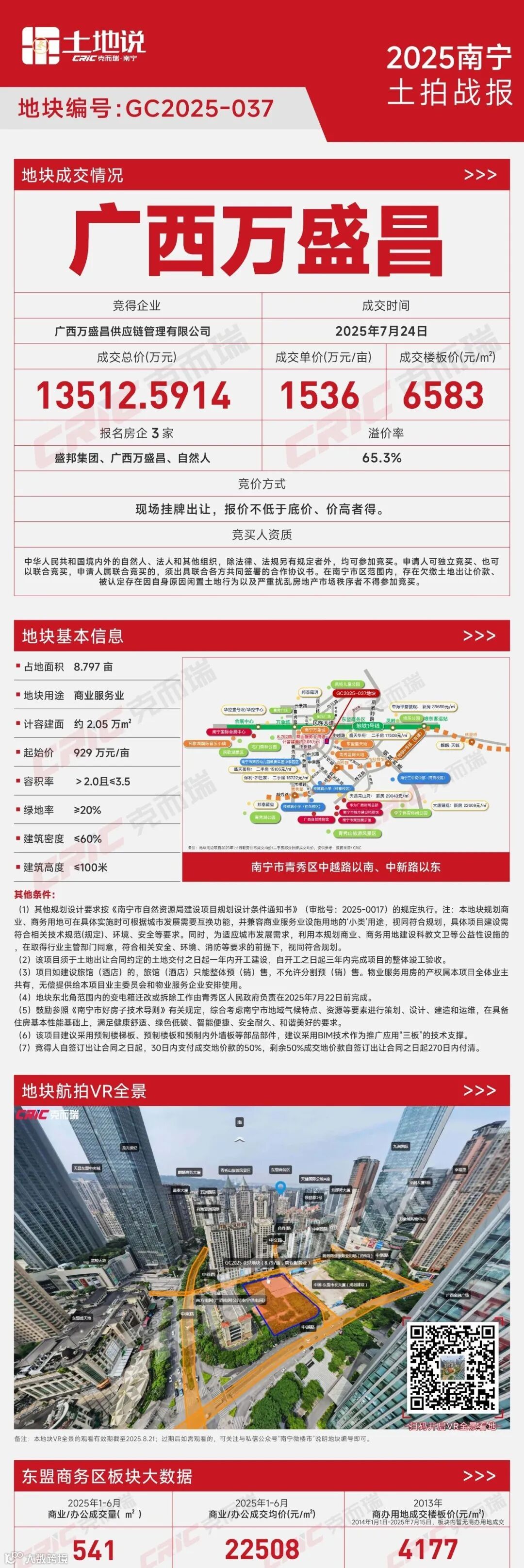 一场长达2个多小时、605轮的激烈抢地大战,吸引了分别来自供应链、房企、图书三大行业的企业激烈争抢,最终GC2025-037地块由非房企“新面孔”——广西万盛昌供应链管理有限公司强势截胡!