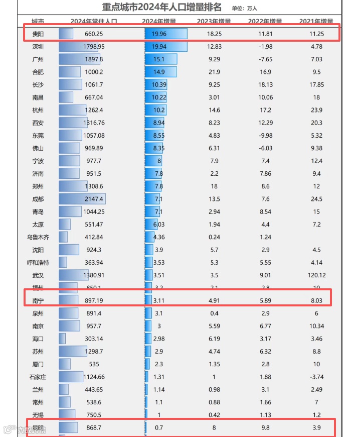 七普之后,2021至2024年,南宁人口整体增量21.94万人。同期,贵阳的人口增量却高达61.27万人,每年增长超过10万人,增量显著。2024年,贵阳人口增量更是位居全国第一,取代了常年霸榜的深圳。