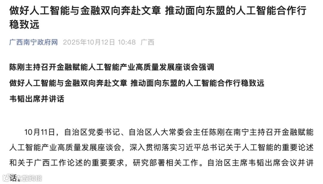 10月11日,陈书记亲自主持座谈会,牵头为广西的人工智能“找钱”,通过金融赋能人工智能产业高质量发展。