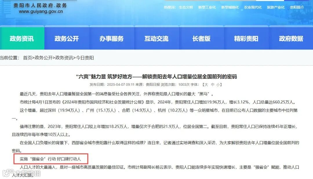 今年4月份贵阳日报发布的文章中提到,“强省会”赋能,推动人口人才大汇聚。
