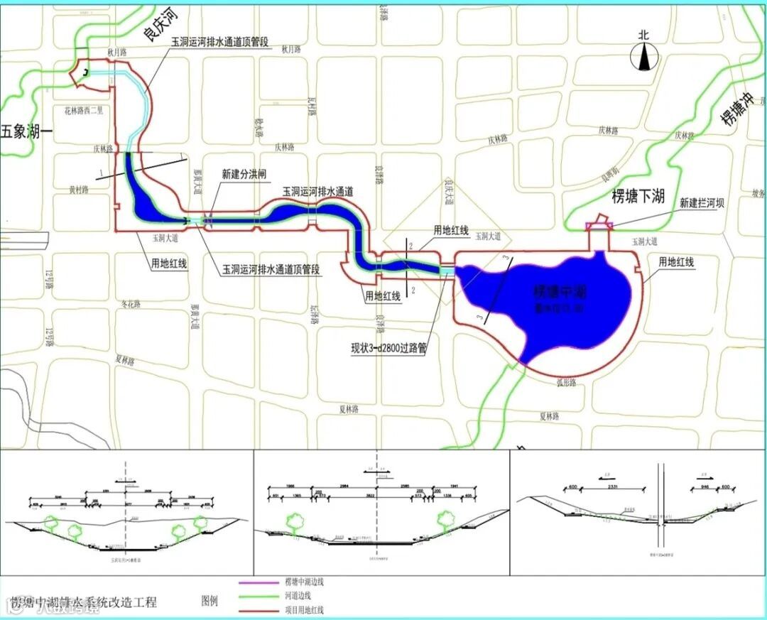 建设内容主要包括玉洞运河、楞塘中湖两大部分。玉洞运河起于体强路与秋月路之间的良庆河段,止于楞塘中湖,运河中线总长约2562米。