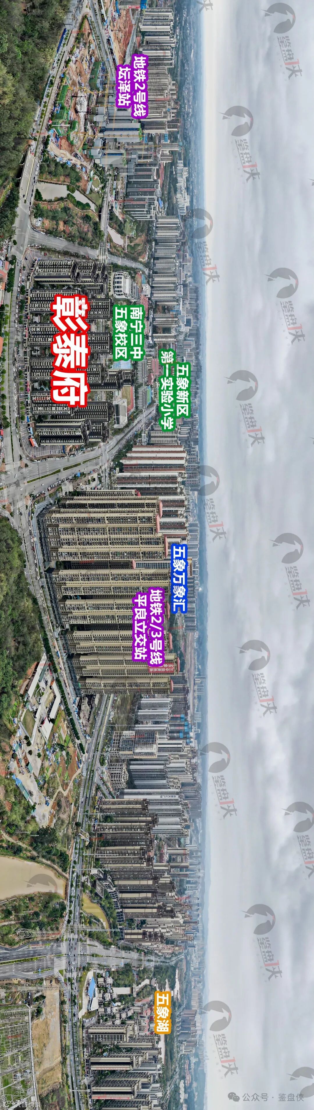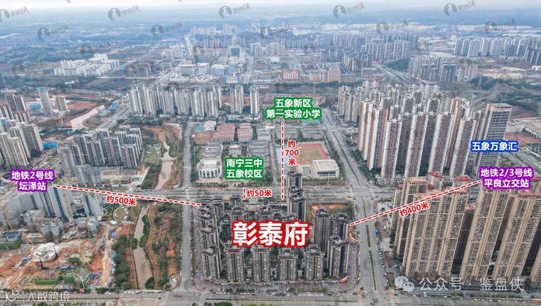 从鉴盘侠的最新实景航拍来看,在售楼盘彰泰府南侧紧邻南宁三中五象校区,距离五象实验一小也很近,是入读五象实验一小+三中最稳的楼盘之一。