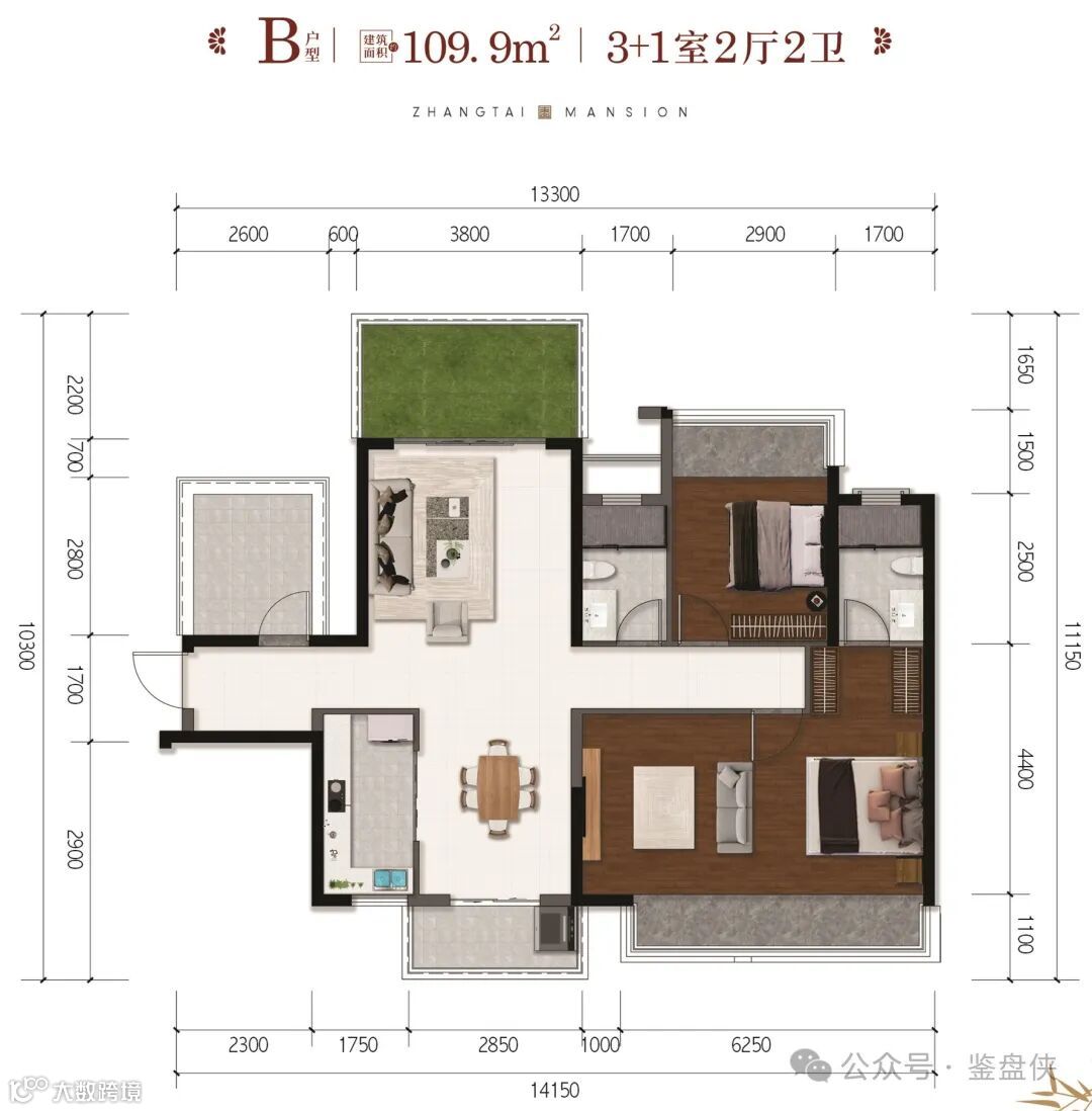 最大的户型是110㎡,赠送面积高达20㎡,客厅开间达到4米。南北对流双阳台设计,主卧带独立衣帽间,可做舒适型四房,适合读书兼改善居住的家庭。