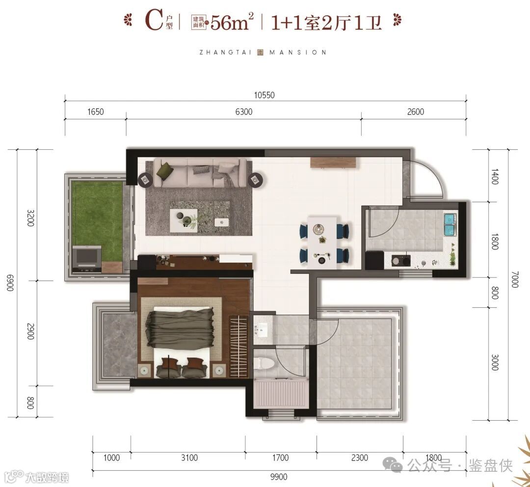 虽然只有56㎡,但紧凑实用,麻雀虽小五脏俱全。厨房、卫生间、卧室、阳台均配有,关键是它可以做两房,适合为了读名校的小家庭买入。