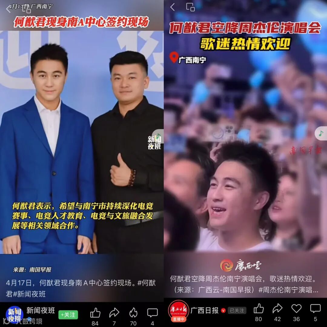就连“赌王之子”何猷君都现身演唱会,这位富三代4月中旬刚来南宁参加南A中心签约仪式,没几天又在南宁看周杰伦演唱会,合理怀疑这哥为了看演唱会,签约仪式后压根没离开南宁。