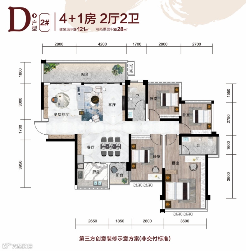 121㎡的4+1房,客厅超大,开间达到了豪横的7米,同时还能做到四房。餐厅开间同样保留到了4.5米,还有双阳台设计。朝北的景观大阳台,朝南的生活阳台,形成对流。这个户型非常适合多孩家庭的大户人家。