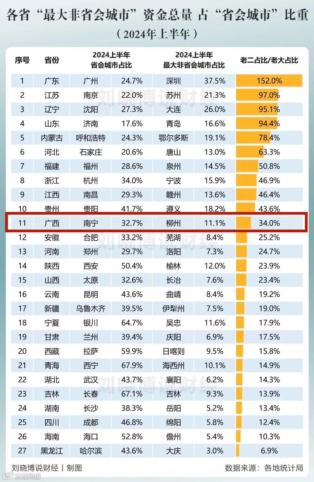 而同样来源于“刘晓博说楼市”的统计数据显示,广西的GDP老二是柳州,资金总量第二是桂林,桂林的资金总量占南宁比重为35.7%,柳州为34%,排在全国11位,还是很靠前的。