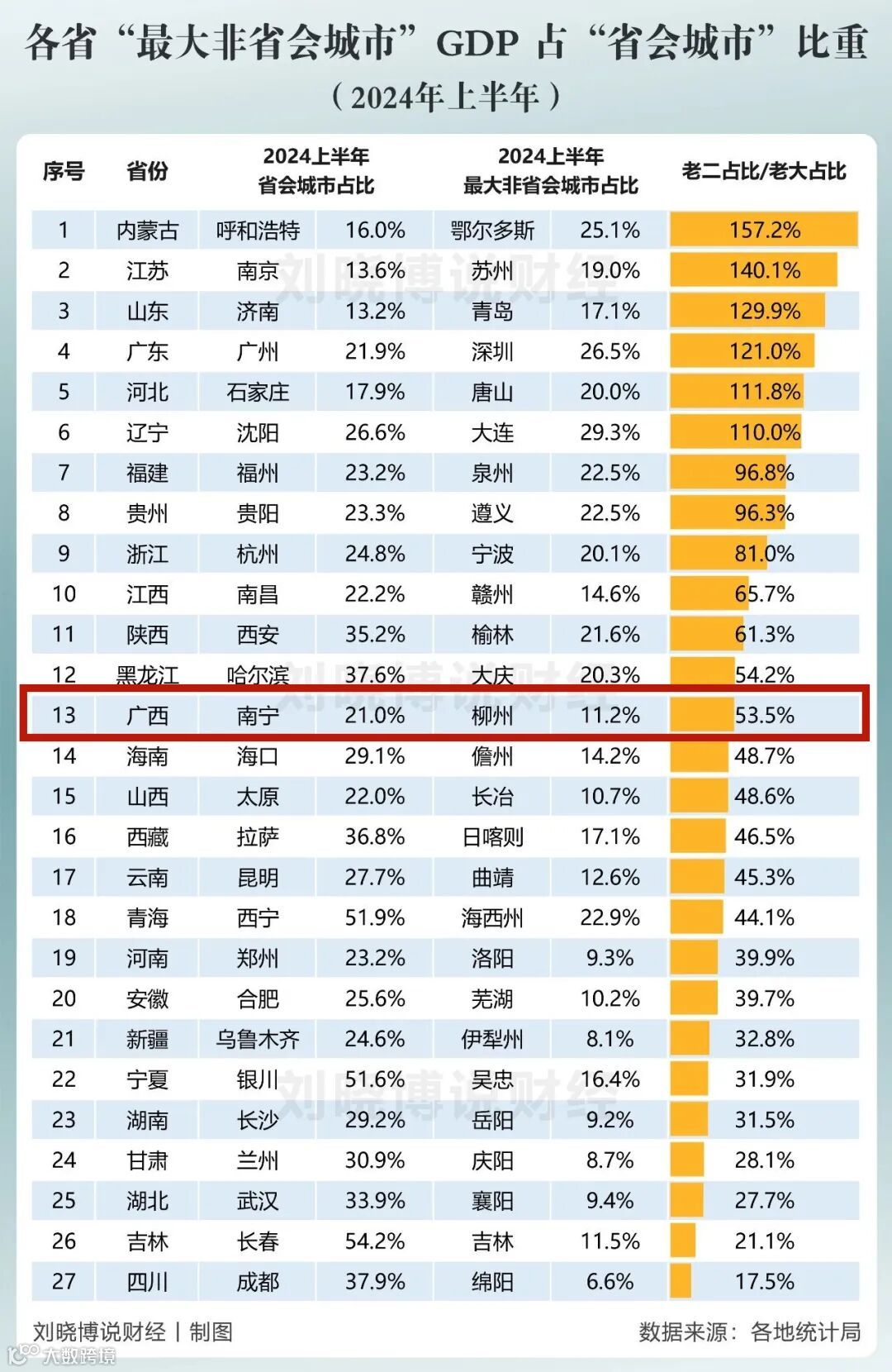 老二柳州的GDP占老大南宁的GDP比重为53.5%,全国排名13,还是挺高的。