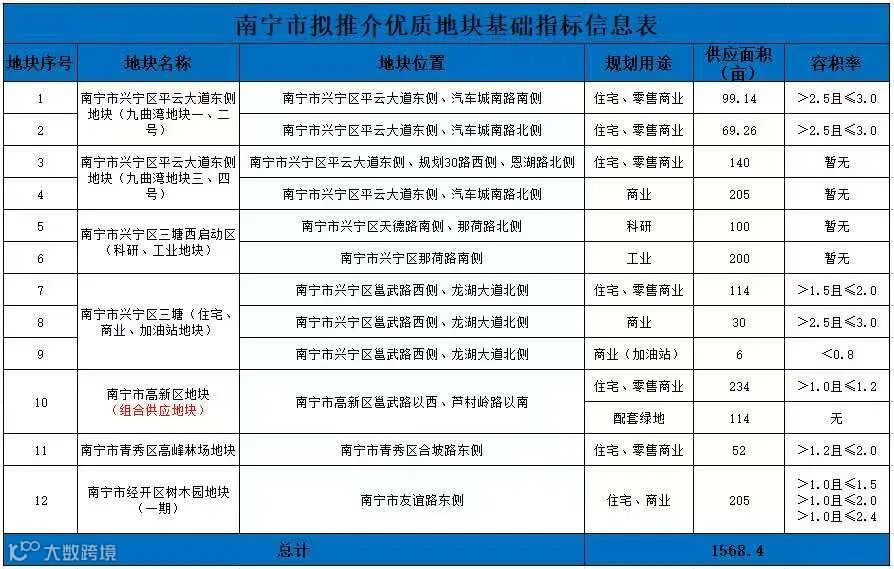 作为本次推介地块数量和面积最大的城市,南宁市拟出让地块12宗合计约1568亩,地块性质涵盖纯住宅、商住、商业、科研、工业等,分布于青秀区、兴宁区、经开区。整体来看,南宁的12幅地块涵盖大中小体量。