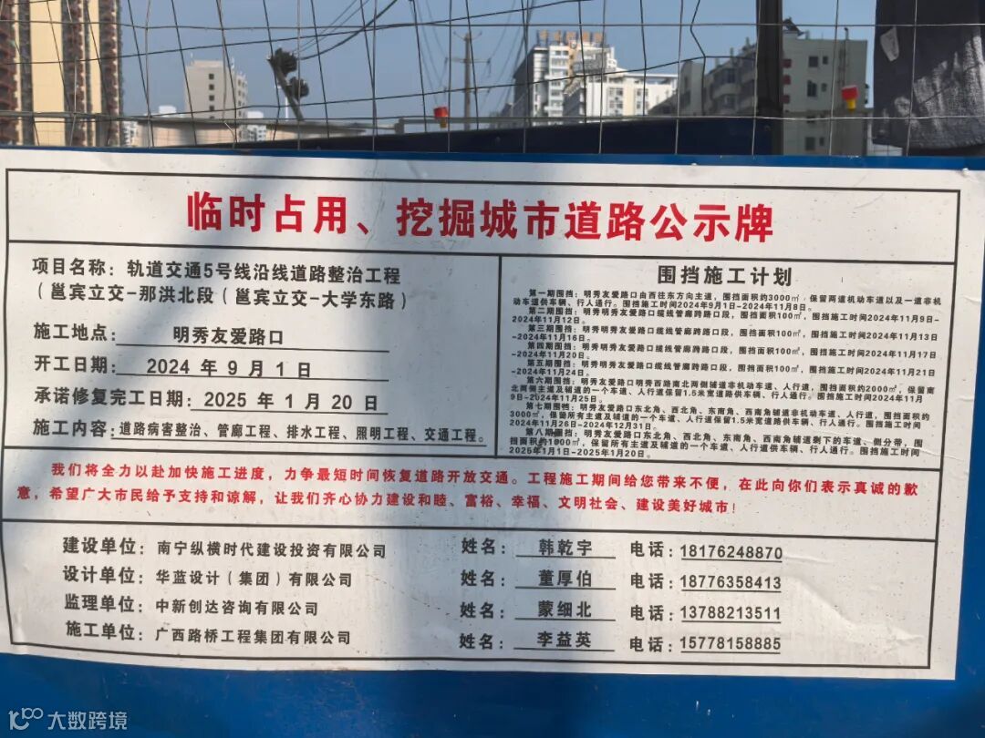 就这几天,有媒体报道,青秀区林里桥一带的平田路,短短500米的道路修了半年还不见要完工的迹象,原计划竣工日期是2024年10月20日,现在延期到了2025年1月20日。