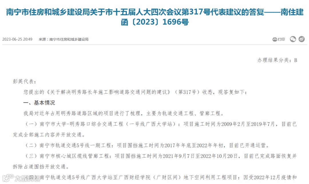 事实上,早在2023年6月25日,南宁市住房和城乡建设局就针对明秀路的问题做出过答复,其中包含有不少信息: