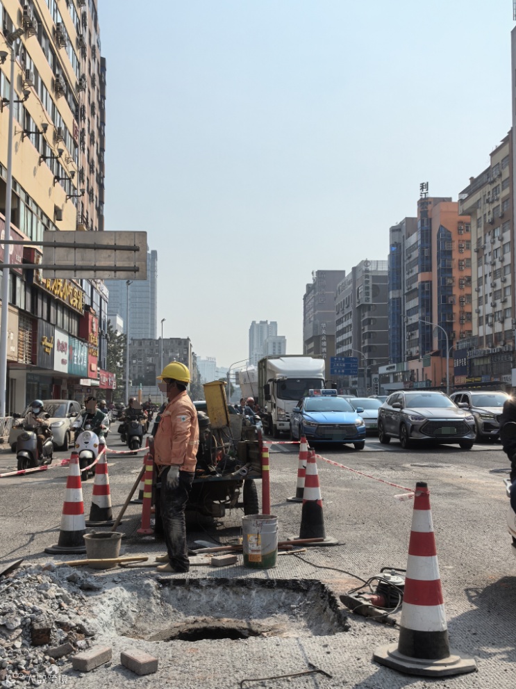 在一处围挡的告示牌上,我找到了关于这项工程的内容简介:道路病害整治、管廊工程、排水工程、照明工程、交通工程。承诺完工日期是2025年1月20日。