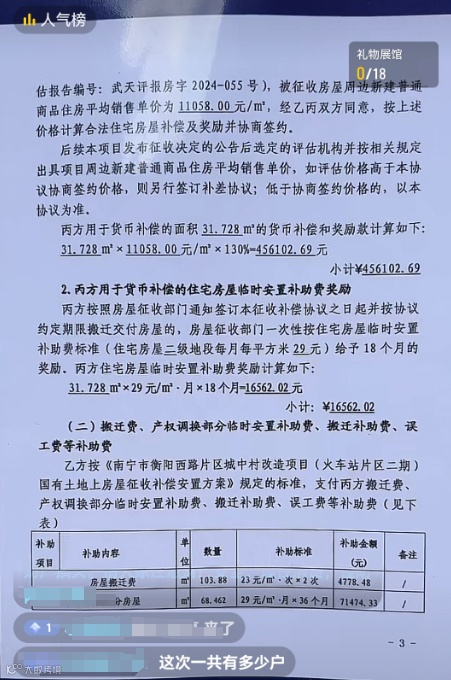 另外还有其他奖励,比如按时签约户奖3万元、整单元签完每户奖励2万元、整栋楼签完每户奖励1万元、按时交材料每户奖励500元等。再加上过渡费,各种奖励摊下来选择货币补偿的赔偿款或超1.5万元/㎡。