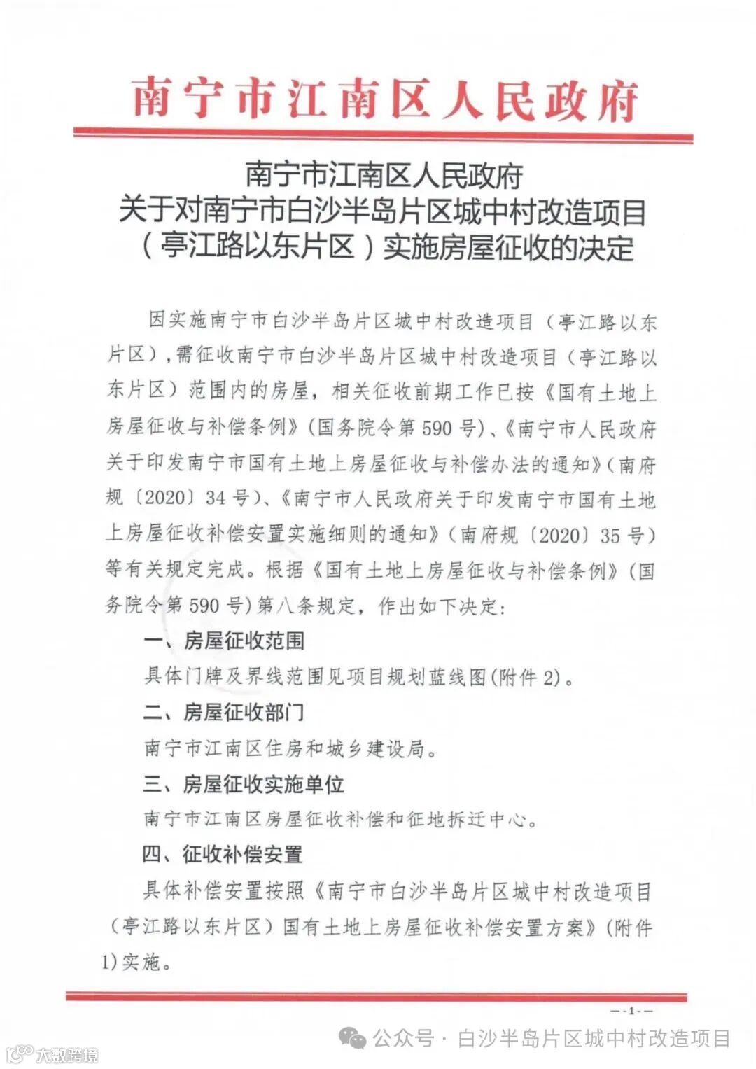 南宁市白沙半岛片区城中村改造项目,9月21日江南区政府官网发布的《关于对南宁市白沙半岛片区城中村改造项目(亭江路以东片区)实施房屋征收的决定》的公告公示内容,也公布了征收补偿安置方案细节等,同样包括了货币补偿、产权调换、选择货币补偿和产权调换相结合的三种方式。