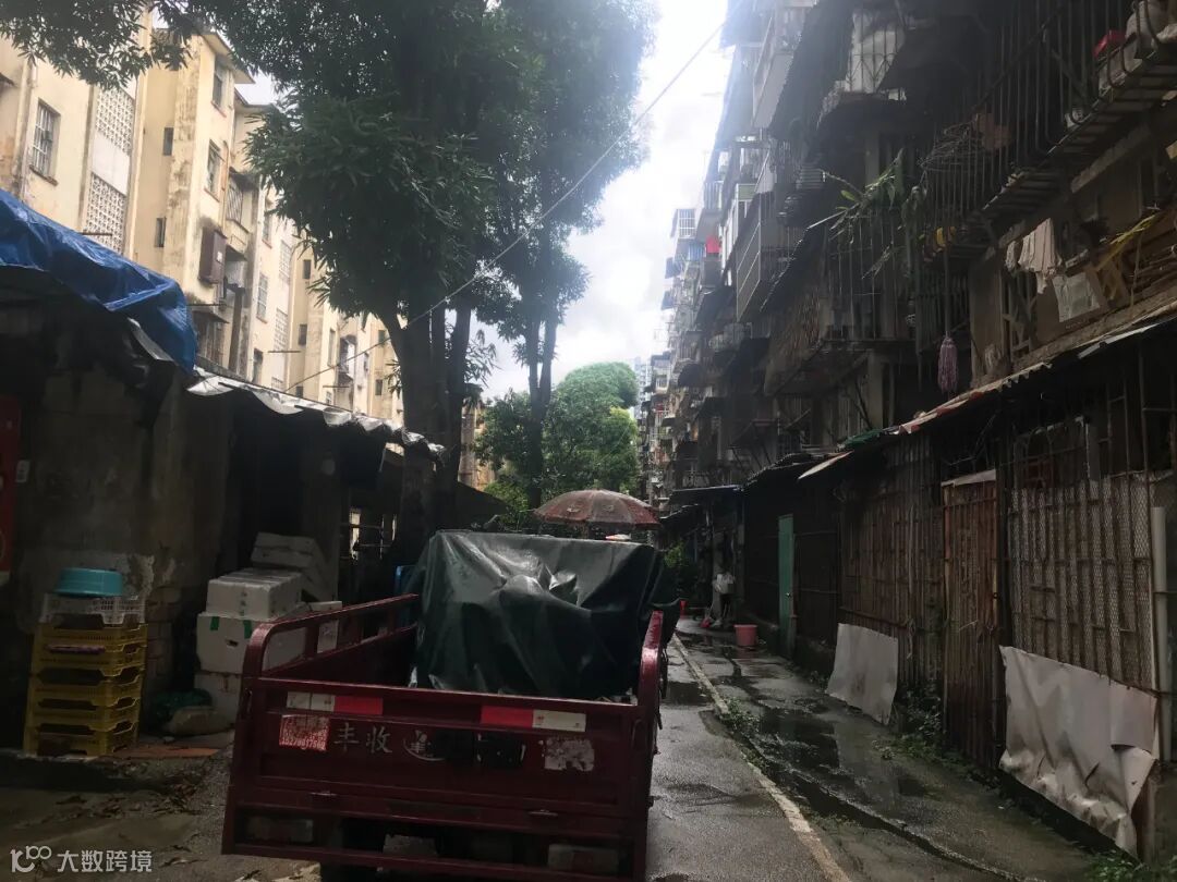 一场阵雨过后,穿插在福建园小区中间的破败坑洼的路上积了不少污水,汽车一驶过,水花飞溅。