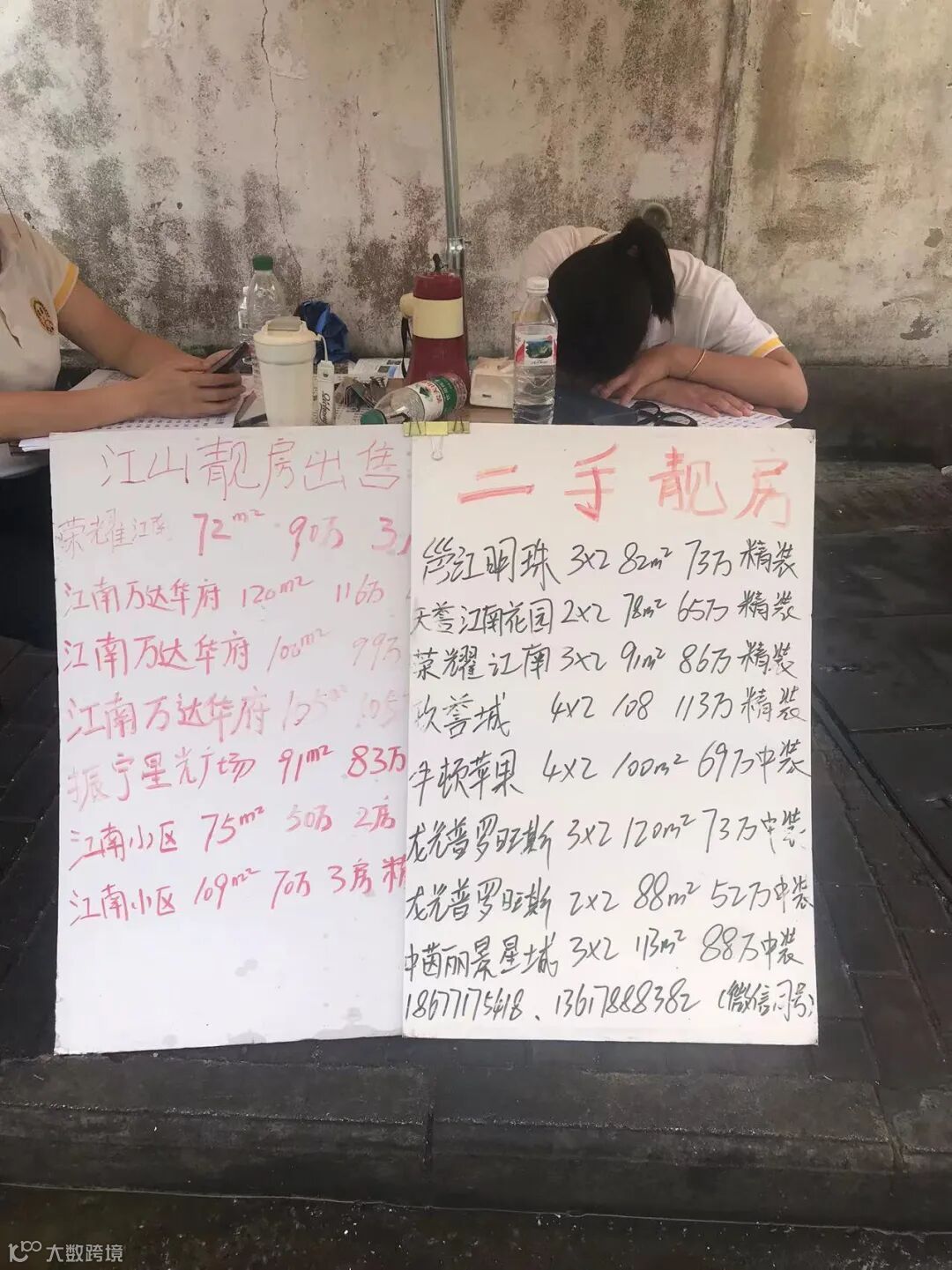 雨后初霁,行人不多,但路边却有不少人支着一个个简易的摊位。走近一看,摆摊的人都是穿着各色工服的房地产中介。一条短短窄窄的小道,中介摊点有5处,一处有2-5个人不等。如果天气晴好,摊点和人数肯定会更多。