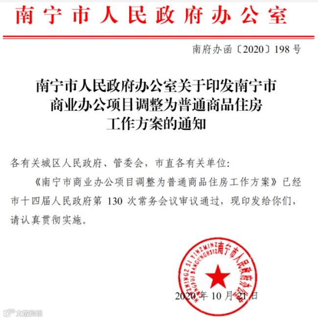 早在2020年10月21日,《南宁市人民政府办公室关于印发南宁商业办公项目调整为普通商品住房工作方案的通知》(下称《通知》)发布。根据文件内容,“商改住”方案的主要目的是为了防范化解商业办公用房高库存风险,促进房地产市场平稳健康发展。