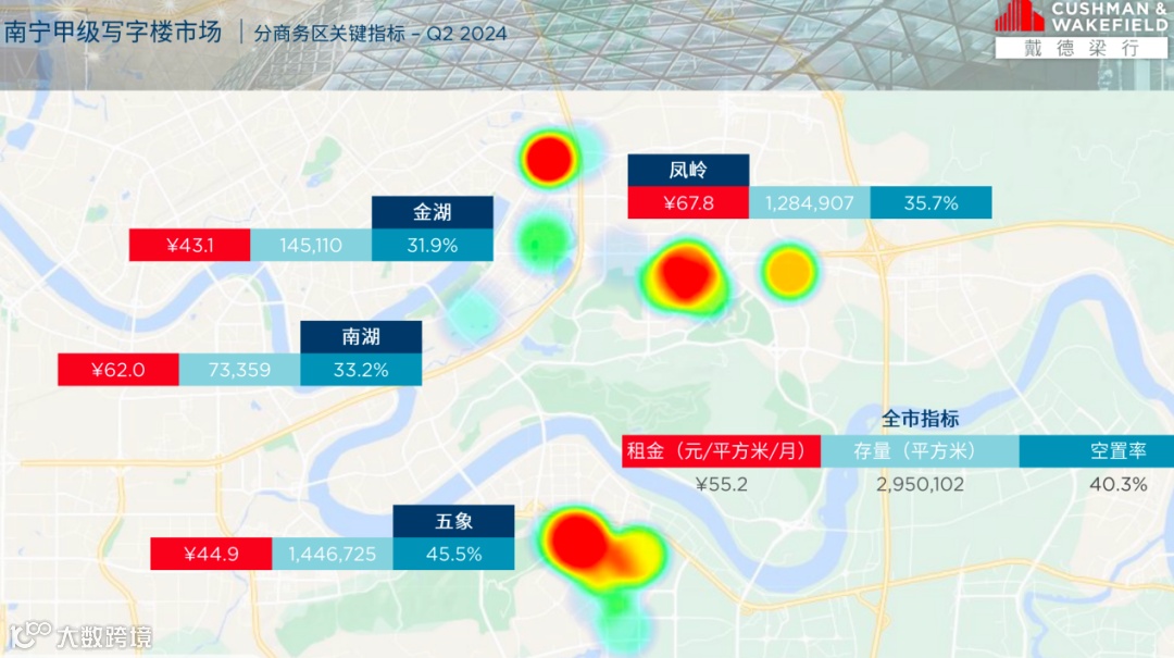 根据戴德梁行数据显示,2024年上半年南宁甲级楼的存量面积达到约295万,空置率已经达到40.3%。这个空置数据还仅仅是甲级写字楼的数据,还不包括一般标准的写字楼和公寓,可以想象南宁写字楼和商业项目的存量和空置压力多大?