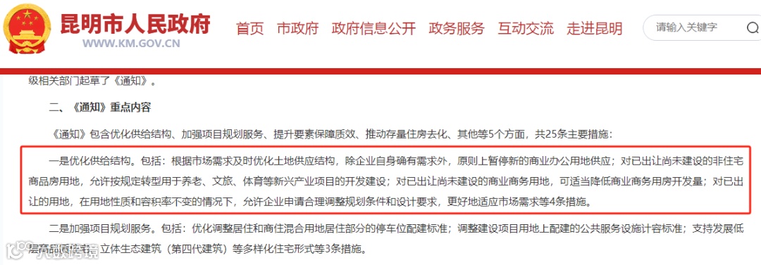 7月8日,昆明市政府官网发布了《关于优化昆明市房地产市场平稳健康发展政策措施》,明确要求暂停新的商业办公用地供应,并允许按程序申请将计划供应的土地调整为居住用地。