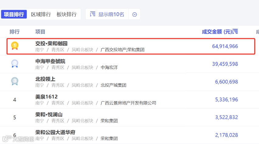 先来看销量方面,根据克而瑞的数据,今年上半年交投荣和·樾园就以3.56亿元入围南宁销售金额TOP10,稳坐凤岭北高端盘热销榜的头把交椅——5月拿下凤岭北销冠。