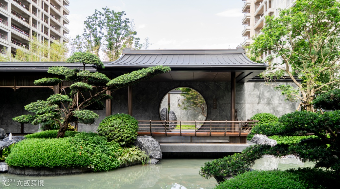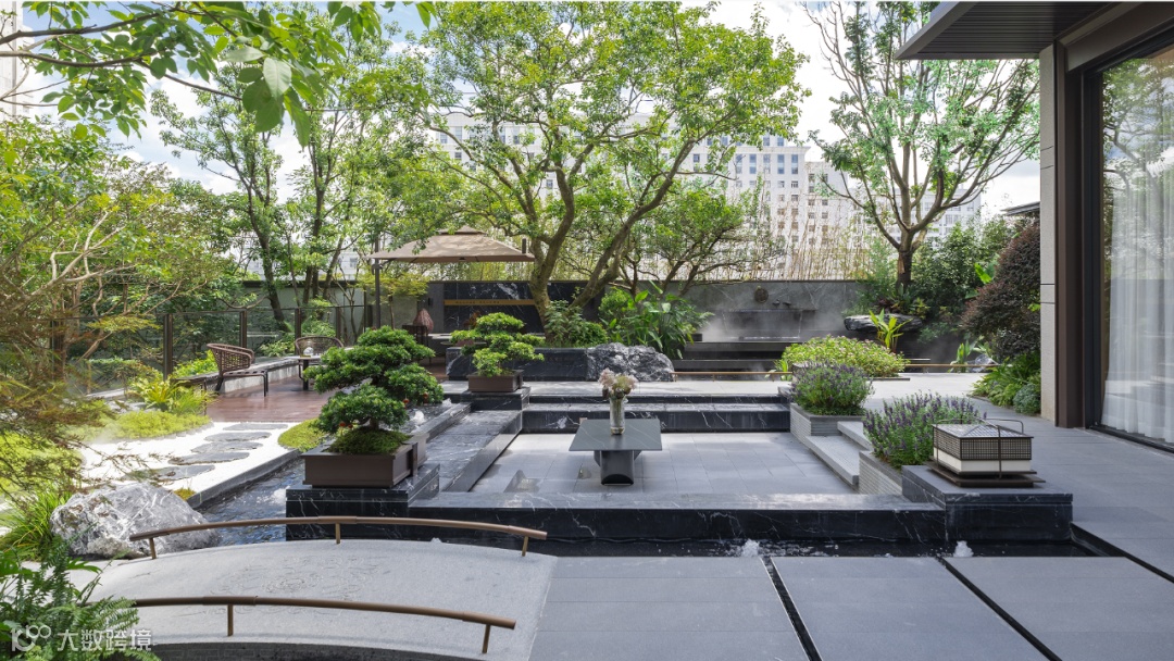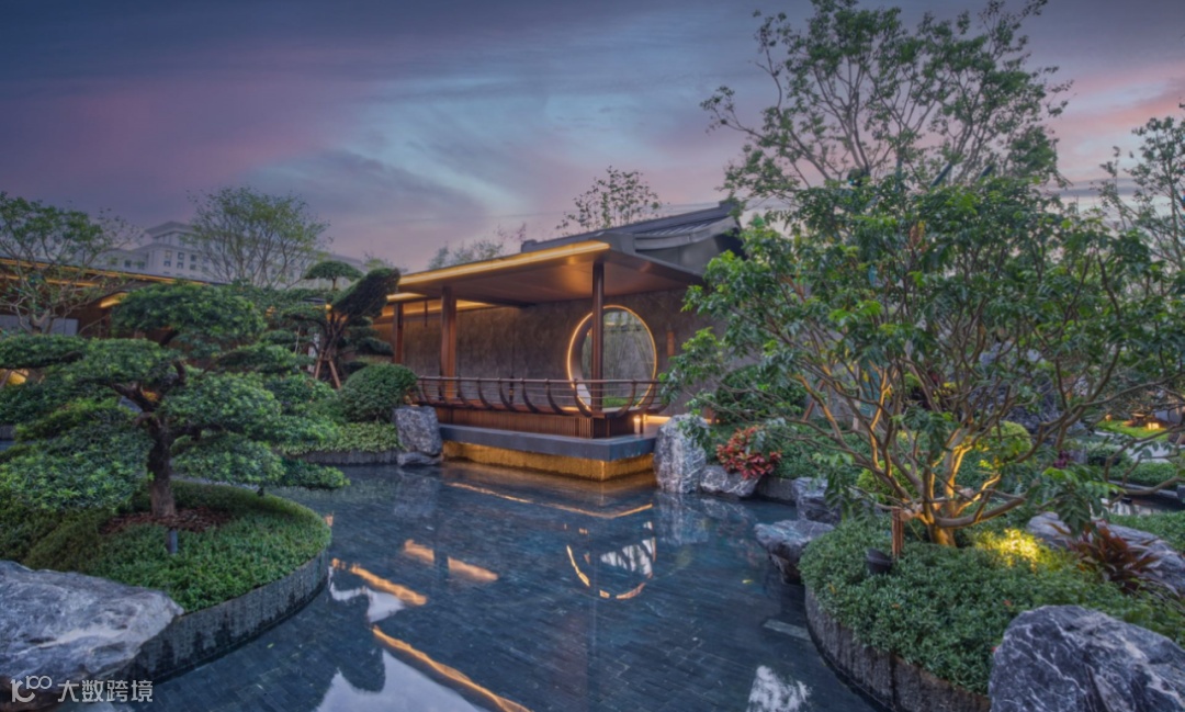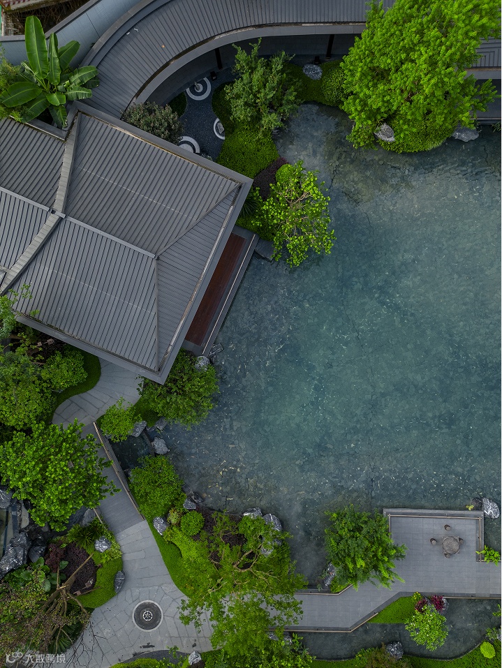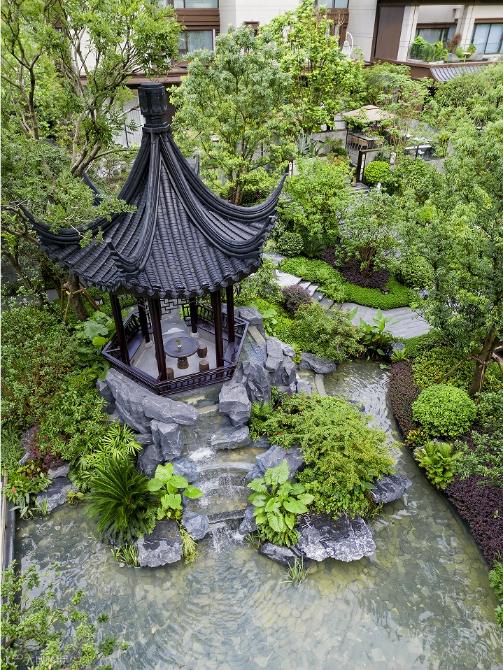 园林内,亭台轩榭、假山水池等经典元素有序、有趣地分部其中,加上各种树种的搭配,中式园林的神韵就被勾勒出来了。下沉庭院一池三山,泗水归堂,新中式园林,禅意十足。