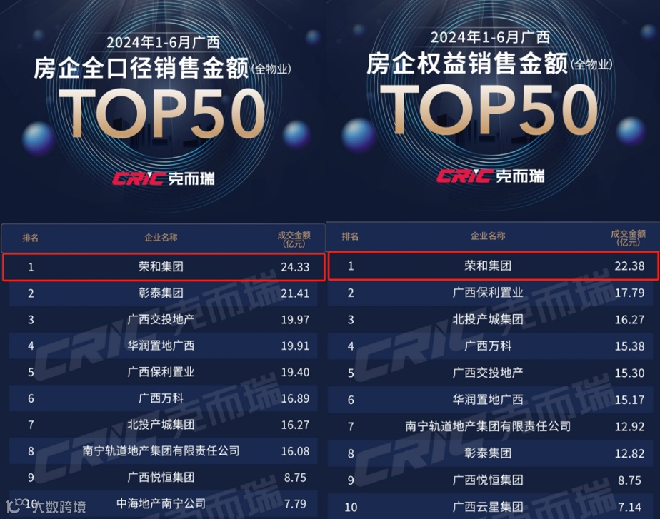 根据克而瑞的数据,荣和不仅高居南宁,更是全广西今年上半年房企全口径、权益(全物业)销售金额的TOP1,实现了在市场上的遥遥领先。