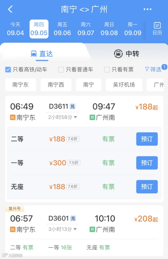 我看了12306,9月5日南宁东往广州南共计有超过80趟动车和高铁,其中打折力度最大的是早上7:02分和晚上20:40分始发于南宁东的D3657和D3647,车票全部执行4折,折后二等座和无座为100元一张,一等座160元每张。