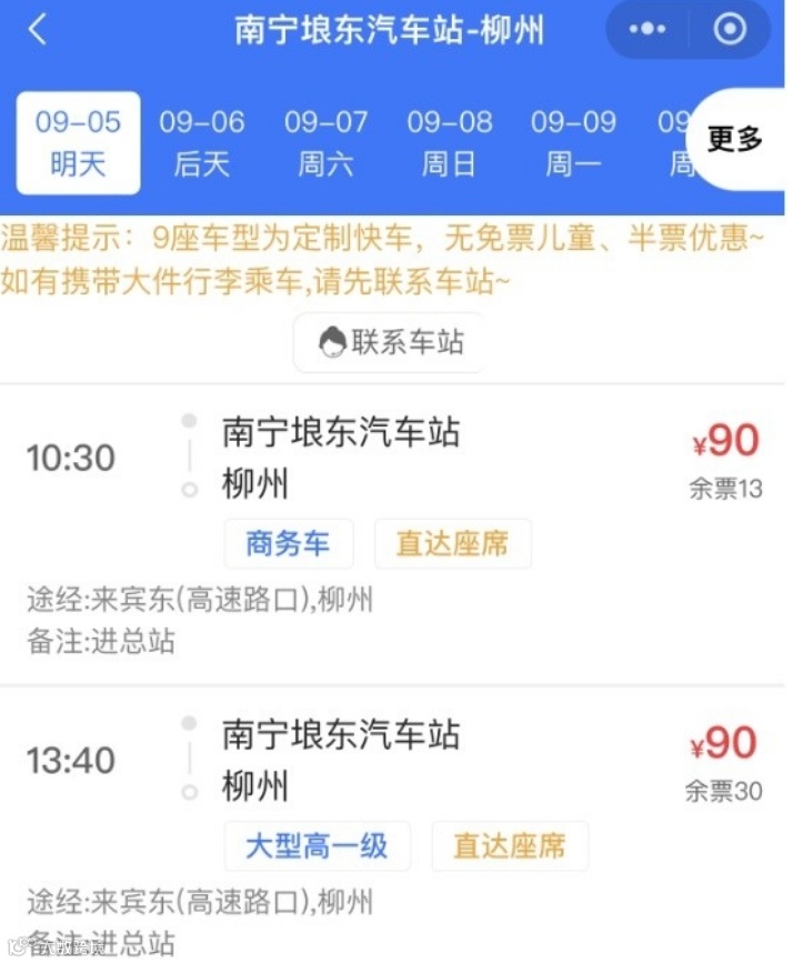 再看柳州。从网上查询到,在东站投入使用以前,埌东客运站到柳州的票价是70元,现在是90元,貌似涨了20元。但是,要知道以前往柳州是每隔10分钟发车一趟,而现在全天只有2趟。