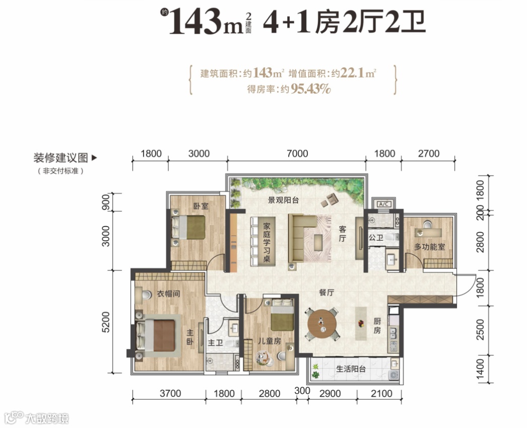 为什么128平米能做出这么阔绰的尺度感来?原因在于高拓展,这户型足足送了约21.4平米!