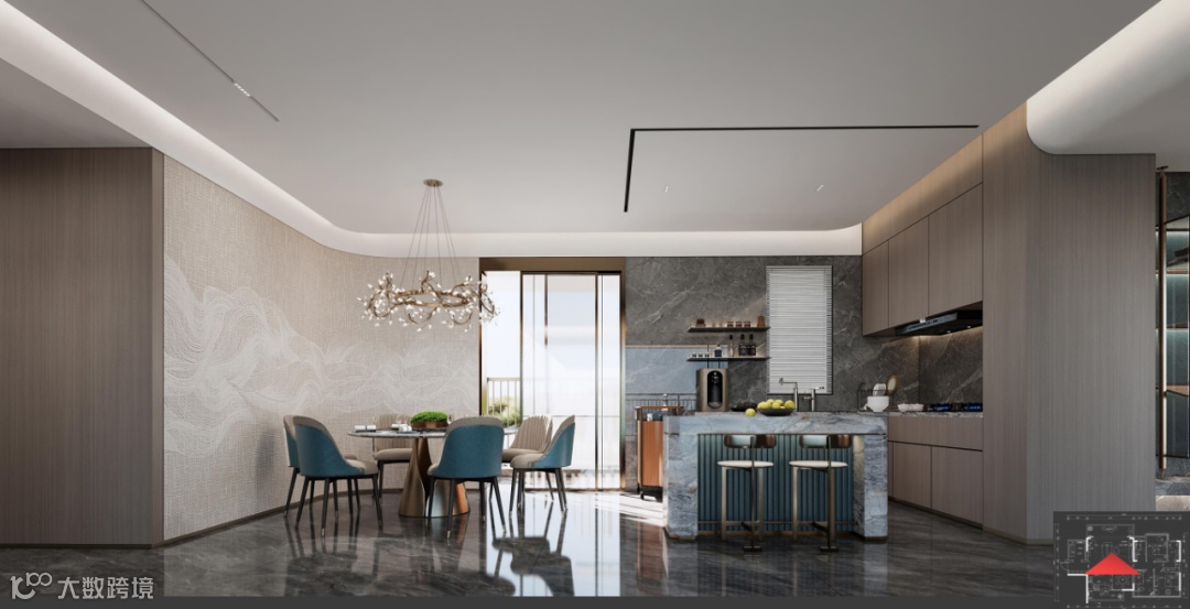 由于空间够大,还能在餐厅设置一个岛台,很实用,而且丰富了生活场景。