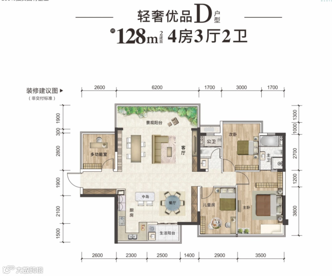 128平米户型做了4房3厅2卫格局,同样是LDKG一体化的设计。整个大厅是等宽的6.2米大通厅,总面积约60平米,非常气派,这在同等面积段的户型里很罕见。