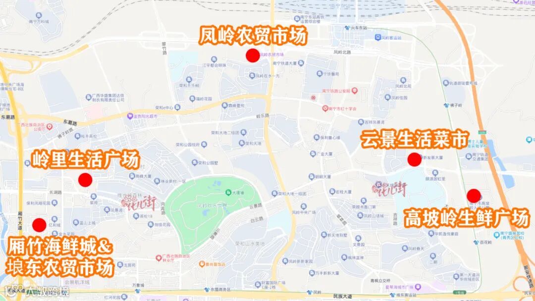 我家有厢竹海鲜市场(对,这也是俺家范围)、凤岭农贸市场、邻里生活广场、云景生活菜市、高坡岭生鲜广场……