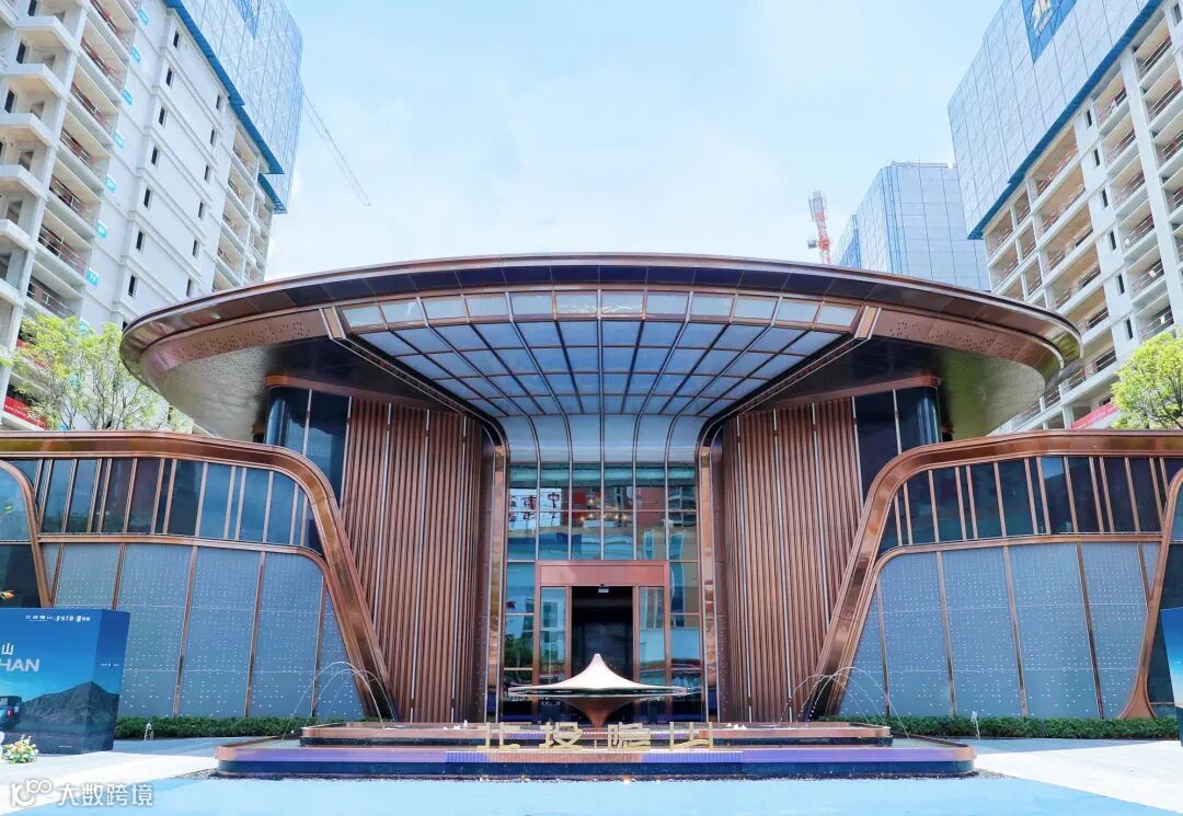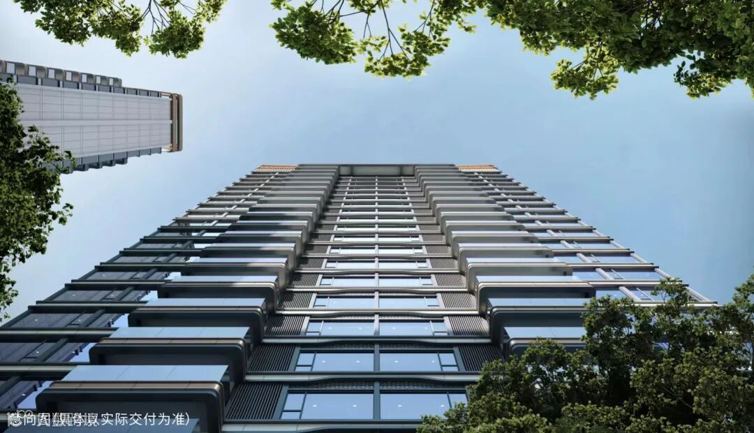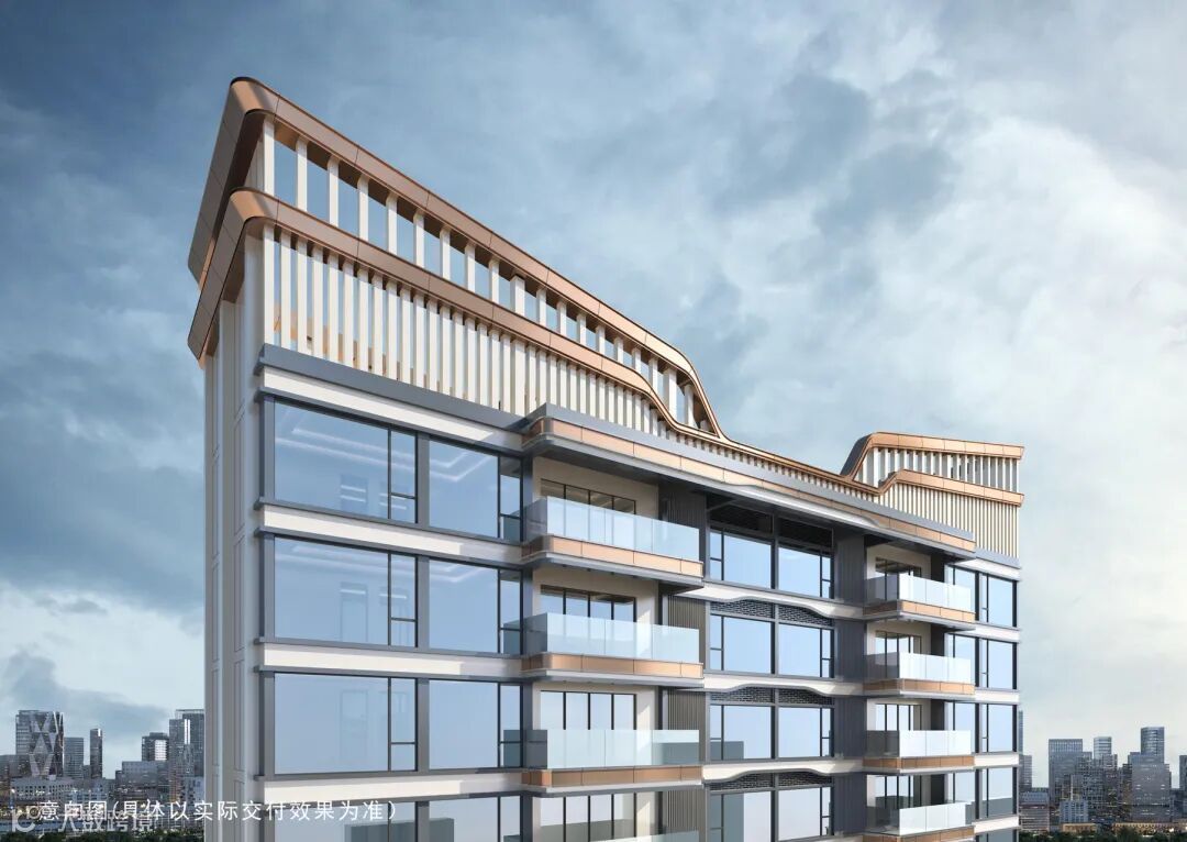 项目的外立面,在玻璃立面的基础上,巧妙叠加玫瑰金铝板,金属挑檐,予建筑以冠,营造出了豪宅才有的高级感和高辨识度。
