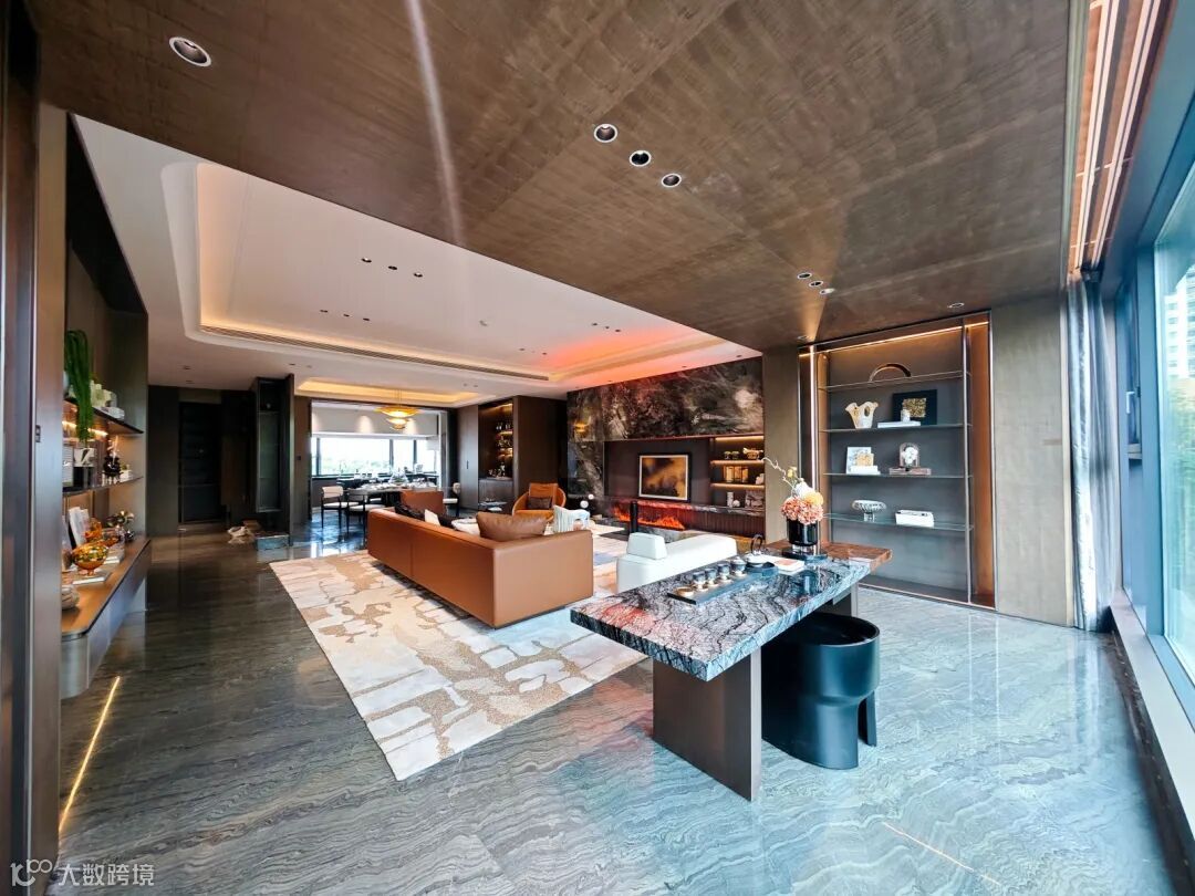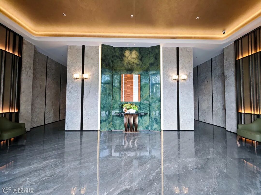 进入楼栋内部,双入户大堂整体延续了主入口的奢华酒店风——