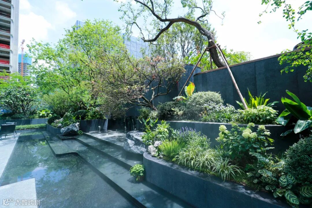 穿过二层会客厅,就是小区的园林。虽只展示了部分园林,但有花池水景、水上漫步道和有森氧会客厅等多重场景,甚至把奢石用到了园林。
