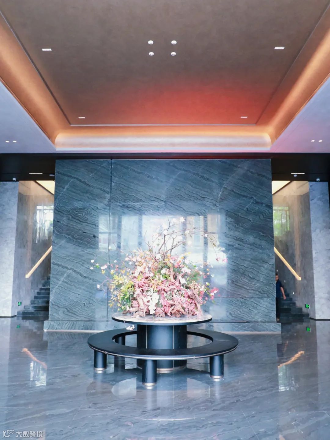 穿过大门,是奢华酒店氛围拉满的艺术大堂,挑高达5.2米,大面积的深色石材和顶部的金属漆,把“隐”和“贵”展现得淋漓尽致。