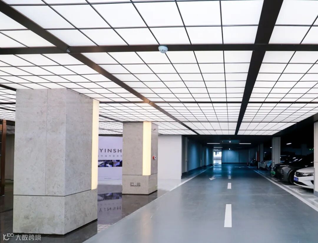 车库内里的装修也堪称奢华,上方亚克力材质配合金属格栅吊顶,勾勒出国际酒店的低调奢雅质感。