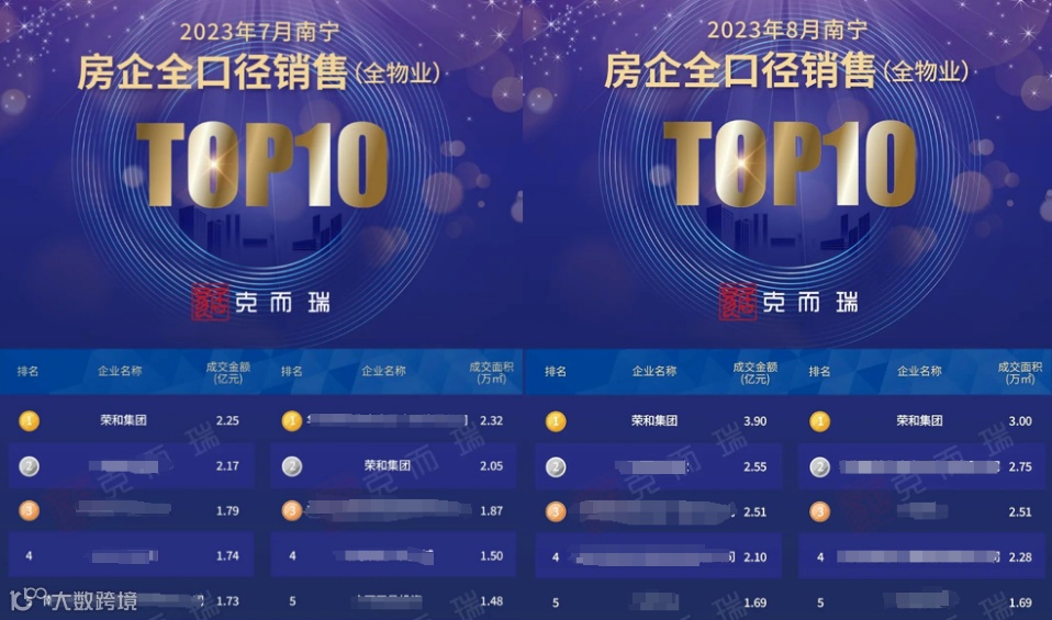 根据克而瑞数据,从过去的7、8月份来看,荣和连续拿下月度南宁房企销冠,包括荣和在南宁的全业态销售金额 TOP1、住宅销售金额TOP1、住宅销售套数TOP1、住宅销售面积TOP1。