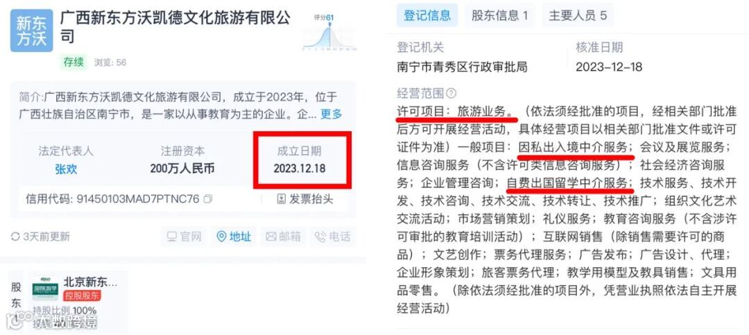 报道显示,新东方文旅近期广西成立了新公司,经营范围均包含旅游业务、因私出入境中介服务、自费出国留学中介服务、互联网销售、旅客票务代理等。