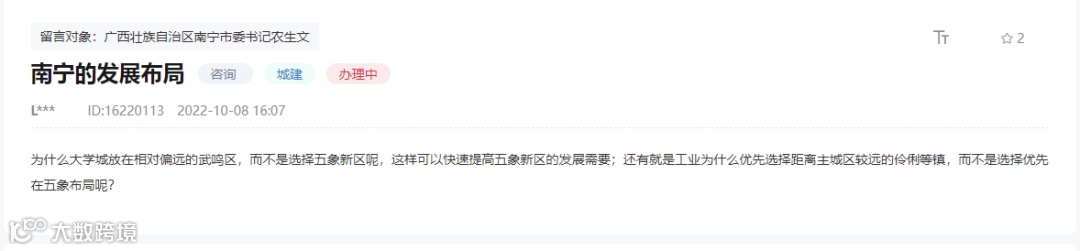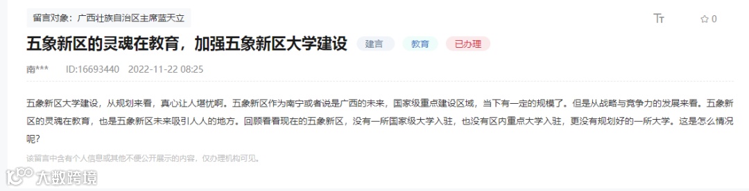 有网友在给领导的留言中提出:五象新区的灵魂在教育,这也是五象最吸引人的地方,但现在五象没有规划好的一所大学,希望加强五象新区大学建设。