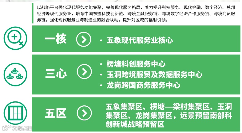 其中,“一核”指五象现代服务业核心;“三心”指楞塘科创服务中心、玉洞跨境服贸及数据服务中心、龙岗跨国商务服务中心;“五区”包括五象集聚区、楞塘—梁村集聚区、玉洞集聚区、龙岗集聚区,远景预留南部科创新城战略预留区。