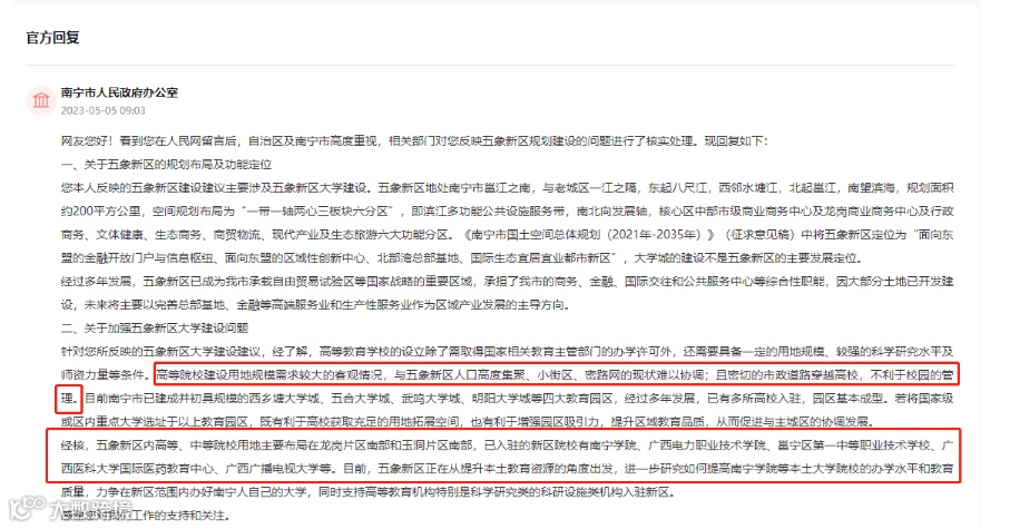 第三、在官方回复中还明确,目前,“五象新区正在从提升本土教育资源的角度出发,进一步研究如何提高南宁学院等本土大学统校的办学水平和教育质量,力争在新区范围内办好南宁人自己的大学,同时支持高等教育机构特别是科学研究类的科研设施类机构入驻新区。”