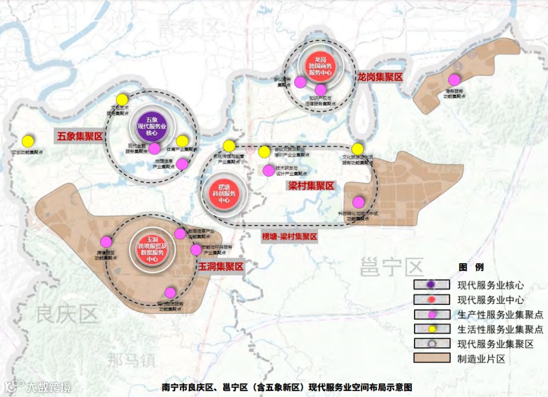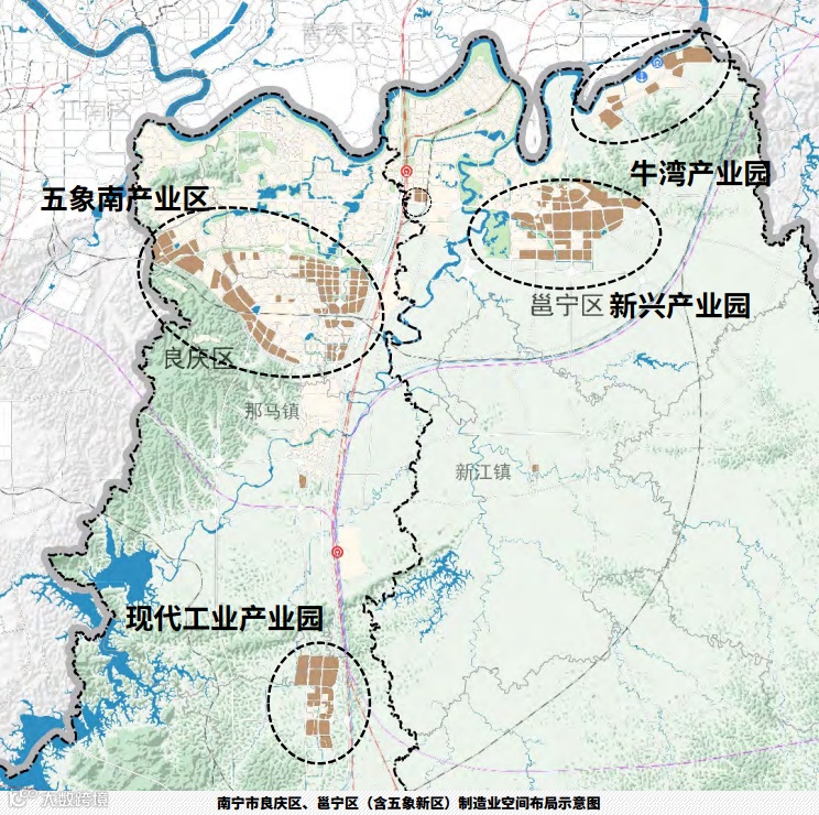 而在现代服务业之外,不仅仅是五象,良庆区和邕宁区都规划了工业制造业产业园。