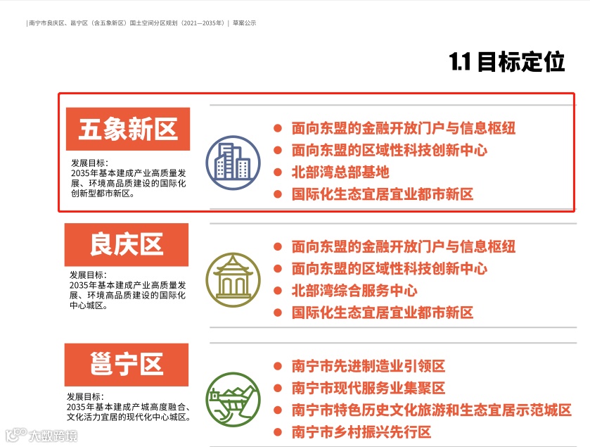 按照近期公布的《《南宁市良庆区、邕宁区(含五象新区)国土空间分区规划(2021-2035年)》草案,五象新区产业要实现:科创引领,构建“一核三心五区”的现代服务业空间布局。