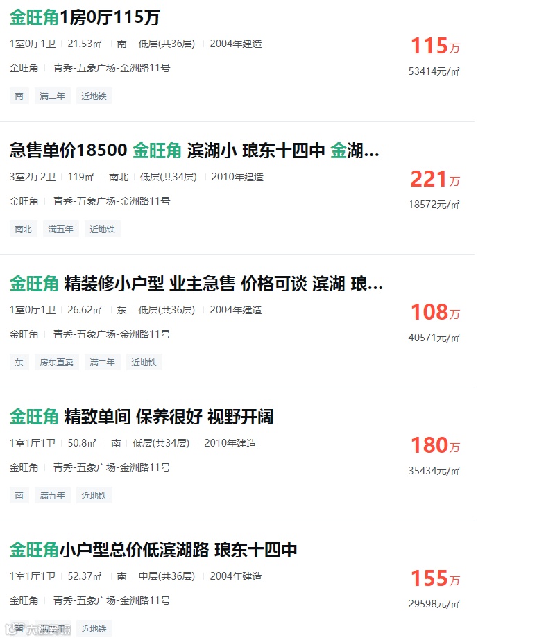如金旺角部分二手房房源的挂牌价普遍在2万-3万+/平,其中,一套26㎡小户型挂牌4万元/平,另一套23平米的挂牌单价为5.3万元/平,堪称南宁房价金字塔顶端。相比之下,没有优质学区或者只是分校学区的楼盘,二手房价格则远低于此。