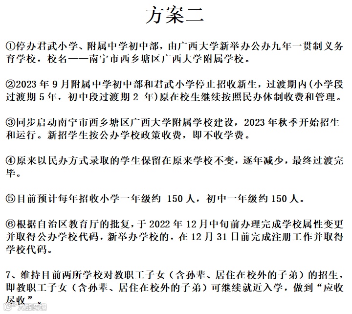 一个方案是,西大附中初中部、君武小学整体移交南宁市教育局管理。另一个方案是,停办两所学校,由广西大学新举办公办九年一贯制义务教育学校。