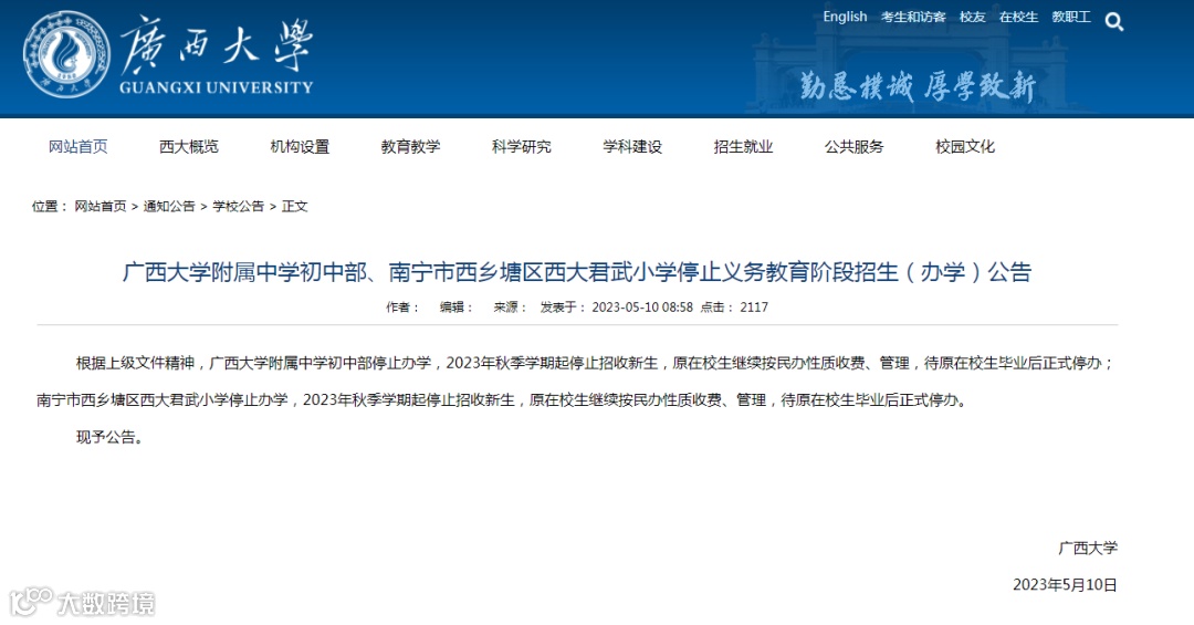 广西大学附属中学初中部(民办),南宁市西乡塘区君武小学(民办)义务教育阶段不再招收新生,原在校生继续按民办学校管理。