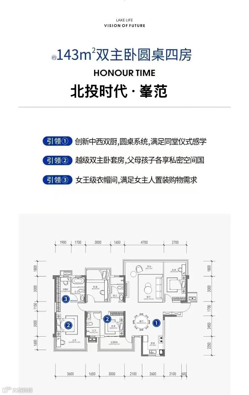 北投时代的大户型组团“峯范”的产品创新,很人性化。98㎡的LDKG巨厅三房;143㎡双套房+餐厅圆桌四房;207㎡的无界空间,有150平的可改造空间,可以根据家庭人数装修成三口、四口之家。