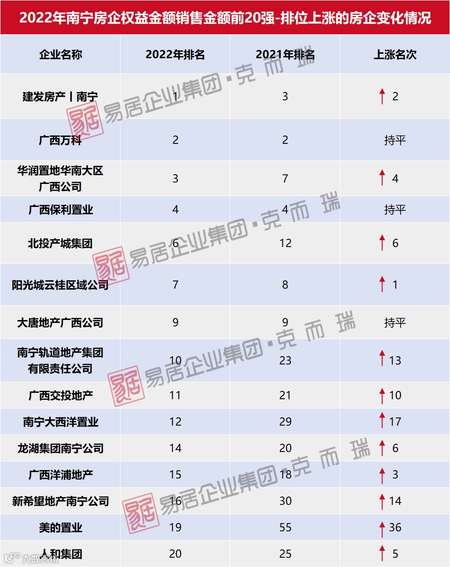 在一些企业退出南宁市场或者大幅下行之下,南宁权益金额榜前20的企业当中,却有12家房企的名次较2021年同期有所上升,而万科、保利、大唐3家房企名次持平,其中,排上前三的企业分别是建发房产|南宁、广西万科、华润置地华南大区广西公司。