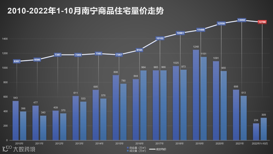 先看整体成交,根据克而瑞发布的数据,截至12月30日,2022年南宁主城区(不含武鸣区)商品房(包括住宅、商铺、车位、写字楼等)新增供应面积504.58万㎡,同比下降54.97%;成交面积585.77万㎡,同比下降29.02%;成交均价10352元/㎡,同比下降11.47%。